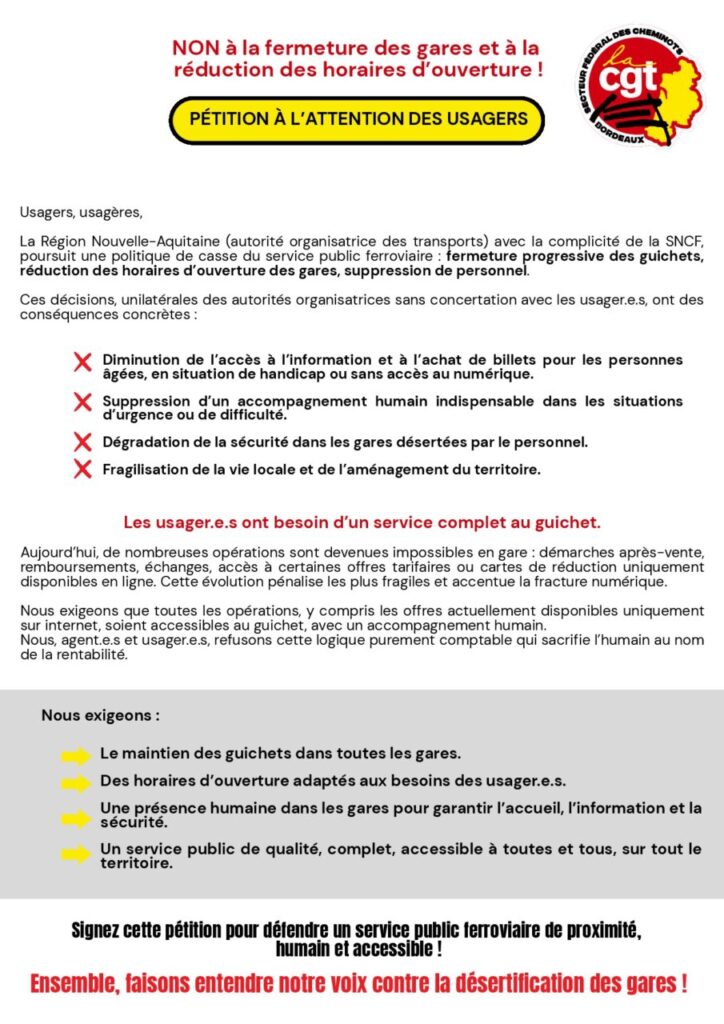 Pétition initiée par la Section Fédérale CGT des Cheminots – Bordeaux en défense du service public ferroviaire qui voit ses moyens humains se réduirent, encore et encore…