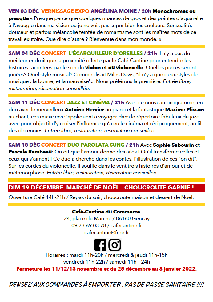 Nous en parlons régulièrement sur Web86 : il se passe toujours quelque chose au Café-cantine de Gençay (du mardi au samedi). Pour en savoir plus un passage (obligé) par leur site est indispensable pour le vérifier. En décembre et malgré les difficultés du moment, rendez-vous les 11, 18 et 19 décembre… Mais l’expo est toujours à voir…