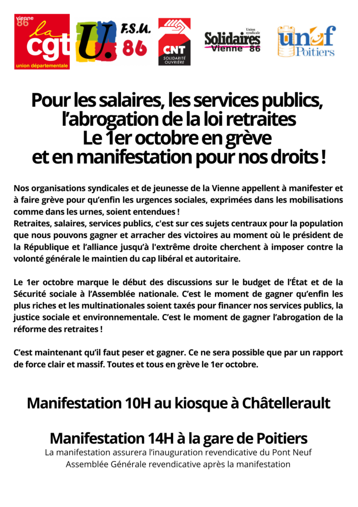 Manifestation rendez-vous Départ de la gare, arrivée au Pont Neuf, passage par la Porte de Paris.