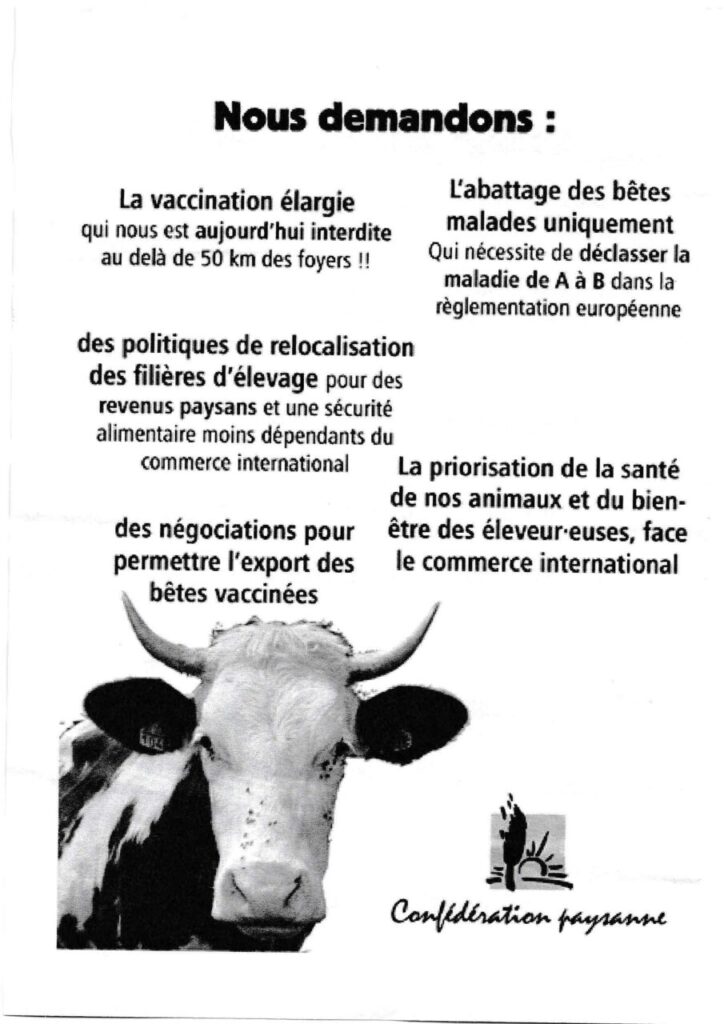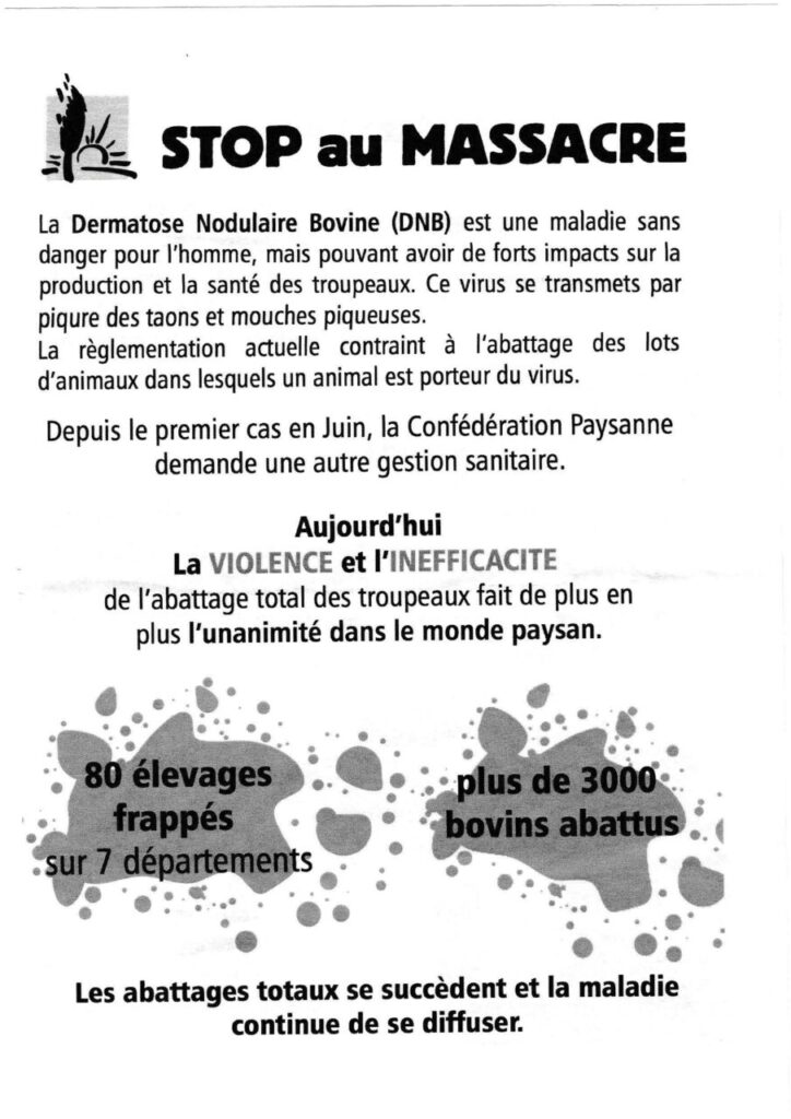 Le tract de Confédération Paysanne 86 distribué le 16 décembre à la sortie de l’autoroute nord de Poitiers : « halte au massacre ! »