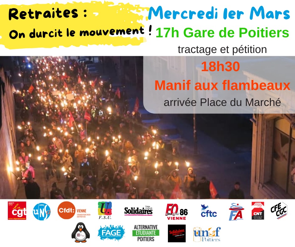 Mercredi 1er mars à 17h00 : manifestation aux flambeaux à Poitiers contre cette réforme des retraites