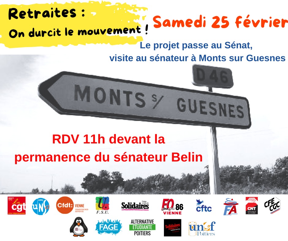 Samedi 25 février à 11 h 00 : mobilisations contre cette réforme des retraites à Monts sur Guesnes
