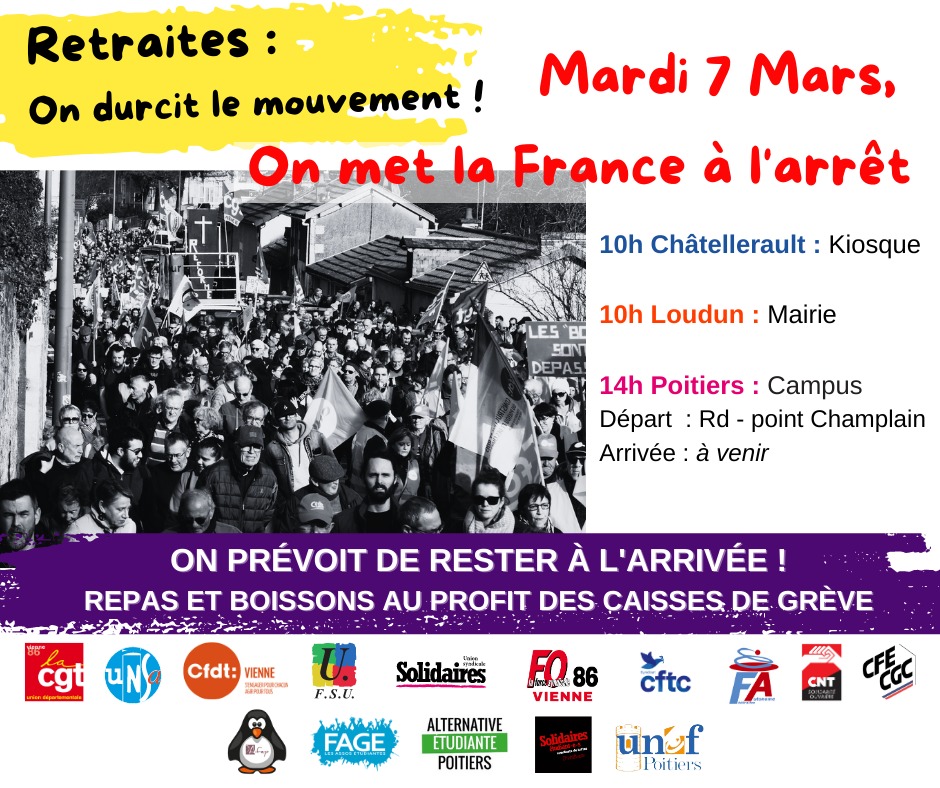 - 14h00 : Poitiers. Départ du campus au rond point du restaurant Rabelais (repas et boissons au profit des caisses de grève)