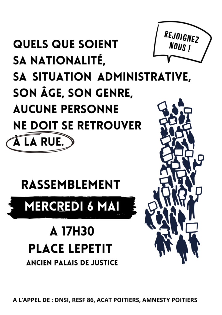lire [tract] Rassemblement à Poitiers le 6 mai parce que tous les soirs des dizaines de personnes dorment à la rue Rédaction 27 avril 2026 Rassemblement à Poitiers le 6 mai parce que tous les soirs des dizaines de personnes dorment à la rue. . Partager : Partager sur Facebook(ouvre dans une nouvelle fenêtre) Facebook Envoyer un lien par e-mail à un ami(ouvre dans une nouvelle fenêtre) E-mail Partager sur LinkedIn(ouvre dans une nouvelle fenêtre) LinkedIn Partager sur Telegram(ouvre dans une nouvelle fenêtre) Telegram Partager sur WhatsApp(ouvre dans une nouvelle fenêtre) WhatsApp Partager sur Mastodon(ouvre dans une nouvelle fenêtre) Mastodon Partager sur Bluesky(ouvre dans une nouvelle fenêtre) Bluesky Rédaction Breaking News web86.info victime de son succès Des sous pour Web86 ! [vidéo] Il y a un an, Lisa Belluco était élue. Une longue interview avec la députée NUPES de la Vienne. Les caisses de grève et de solidarité dans la Vienne [vidéo] Clip de campagne NUPES 86 – V. Soumaille Succès de la compagne de financement participatif de web86.info Financement participatif de web86.info. Ça y est ! C’est parti ! [vidéo] Portrait d’un anticolonialiste conséquent [vidéo] À l’autre bout du monde vivent d’autres humains Extrême-droite dans la Vienne… misère, misère… (1) « Rien n’arrête un peuple qui danse ». La Parade des libertés à Poitiers Règles, menstruations, ragnagna Portrait de militant [Vidéo] Interview de Yves Judde qui a rencontré la sociologie et l’étranger Hélène Heintz Shemwell, activiste écologiste : la marge et la politique [tract] Rassemblement à Poitiers le 6 mai parce que tous les soirs des dizaines de personnes dorment à la rue Guide du Bio dans la Vienne : nouvelle édition 2026-2027 [Photos-Vidéo] A Vaugeton, on veut des fermes, pas des usine à poules ! [vidéo] Nous demandons la PAIX Vivalto Vie « L’art du mépris » 36 jours de grève « La grande panique du Diletta » de Osamu Tezuka aux éditions FLBLB