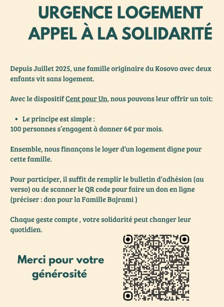 RECTIFICATIF : C’est RESF86 (Réseau Education Sans Frontière) qui a lancé un appel à solidarité pour aider une famille en galère de logement depuis 3 mois. Un relai qui s’effectue au travers de l’association « 100 pour 1 » . A lire, le message ci-dessous ainsi que le bulletin d’adhésion à l’association.