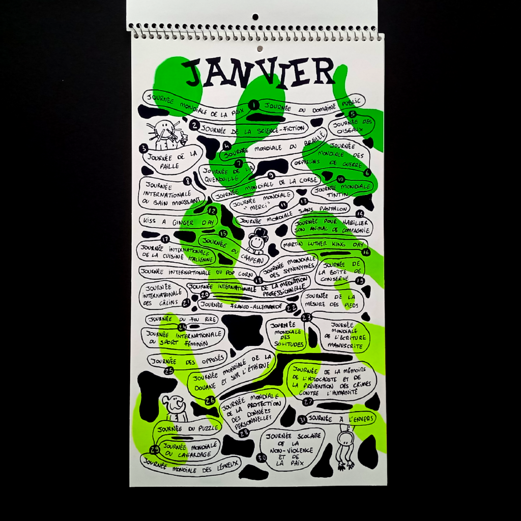 C’est un calendrier à spirale : Tous les jours une nouvelle journée mondiale d’un peu tout et parfois n’importe quoi, grâce au dessinateur Poitevin Corbi.