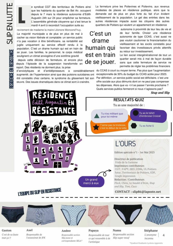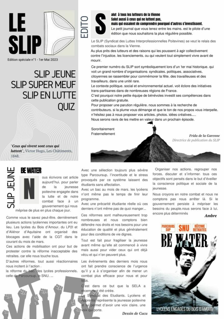 C’est un nouveau journal papier créé par le SLIP (Syndicat des Luttes Interprofessionnelles Poitevines) qui s’adresse à « tous les lutteurs de la Vienne et à ceux qui ne luttent pas mais qui essaient de comprendre pourquoi d’autres s’investissent ».