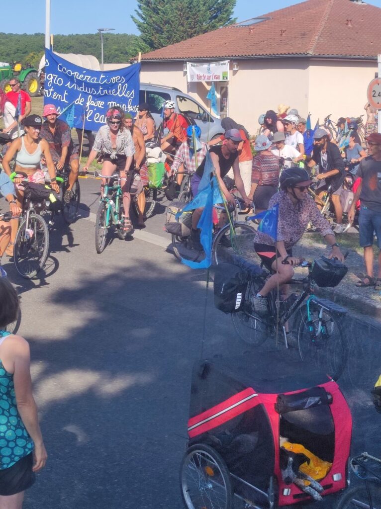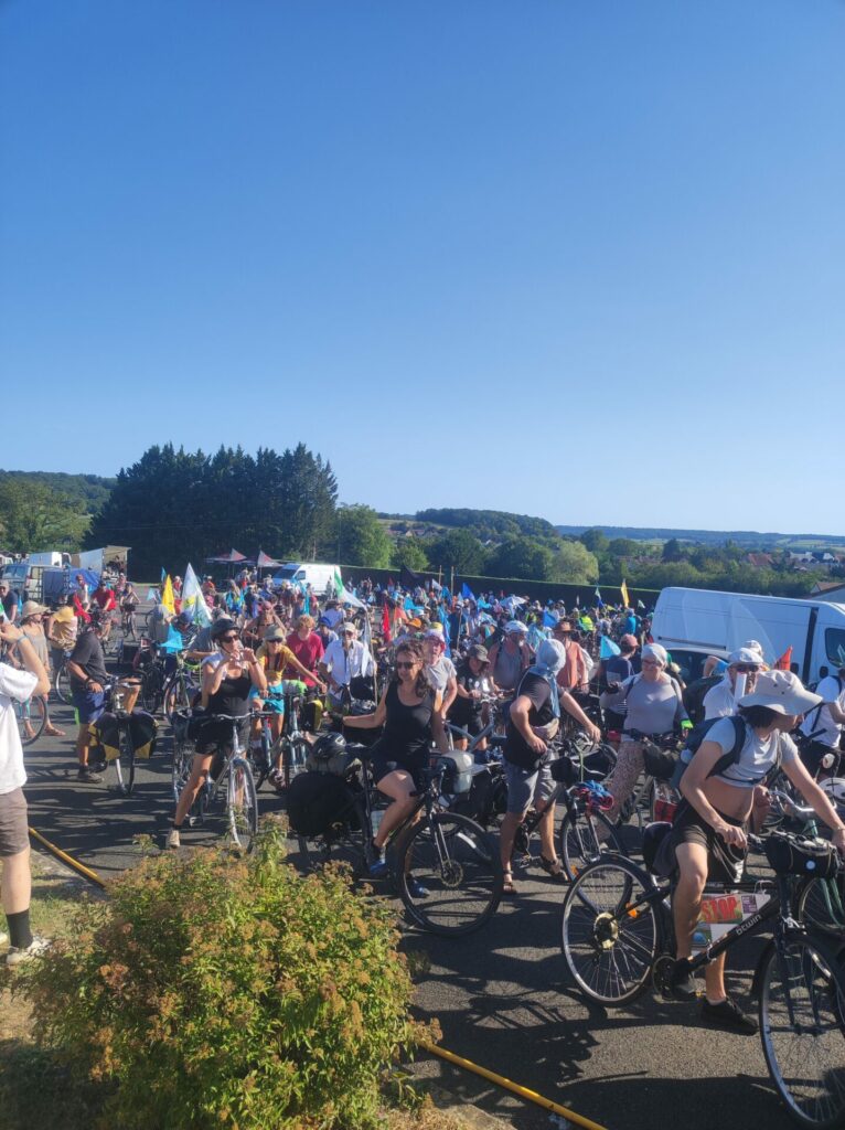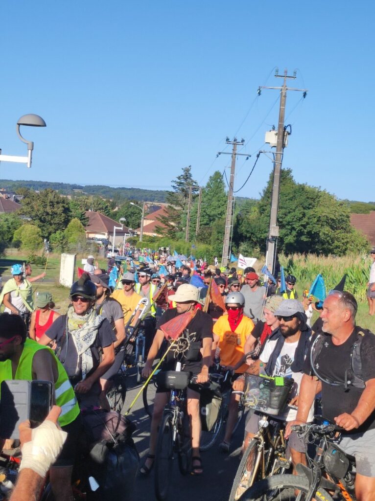 A noter d’abord que lors du passage au chantier de la ferme usine, à pieds, encadrés par gendarmes et CRS, tout s’est bien passé. Les cyclistes ont pu constater l’ampleur des 3 bâtiments (1.5 ha) et écouter les prises de parole d’ASPECT, de Julien Le Guet, d’Elisabeth Michel, maire de Coussay-les-Bois…
