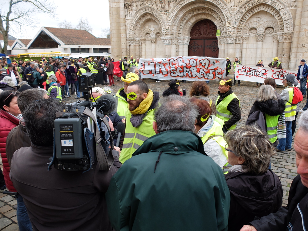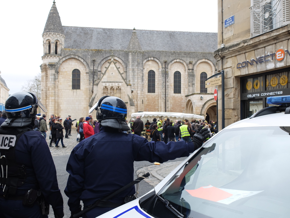 La préfecture avait interdit tout rassemblement ce samedi à Poitiers ce qui est une décision liberticide inédite pour un mouvement social à Poitiers. La place du Marché, lieu de rassemblement des Gilets jaunes était verrouillée par un contingent hallucinant de forces de l’ordre qui fouillaient tout le monde, à chaque entrée de la place, fouillaient aussi les voitures, les poussettes, etc. On se serait cru dans l’Algérie de Bouteflika ou autre régime policier.