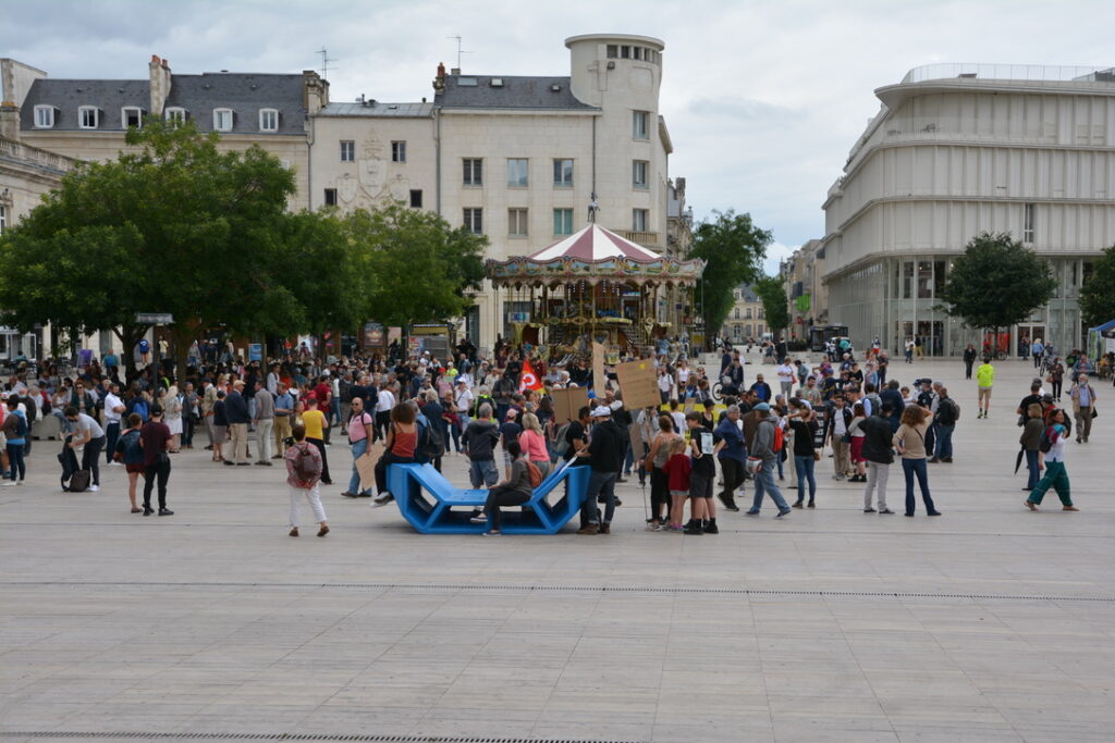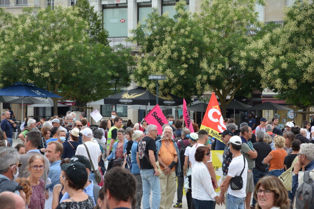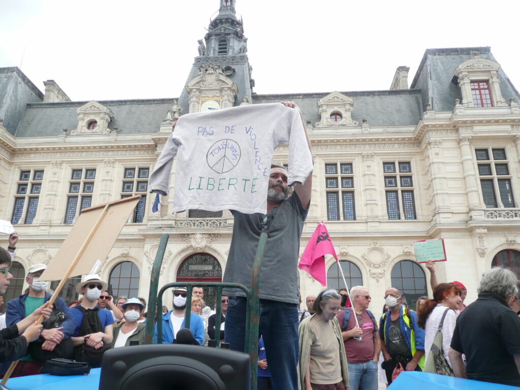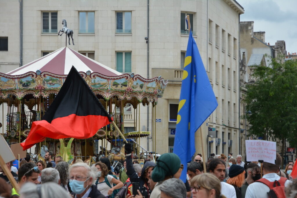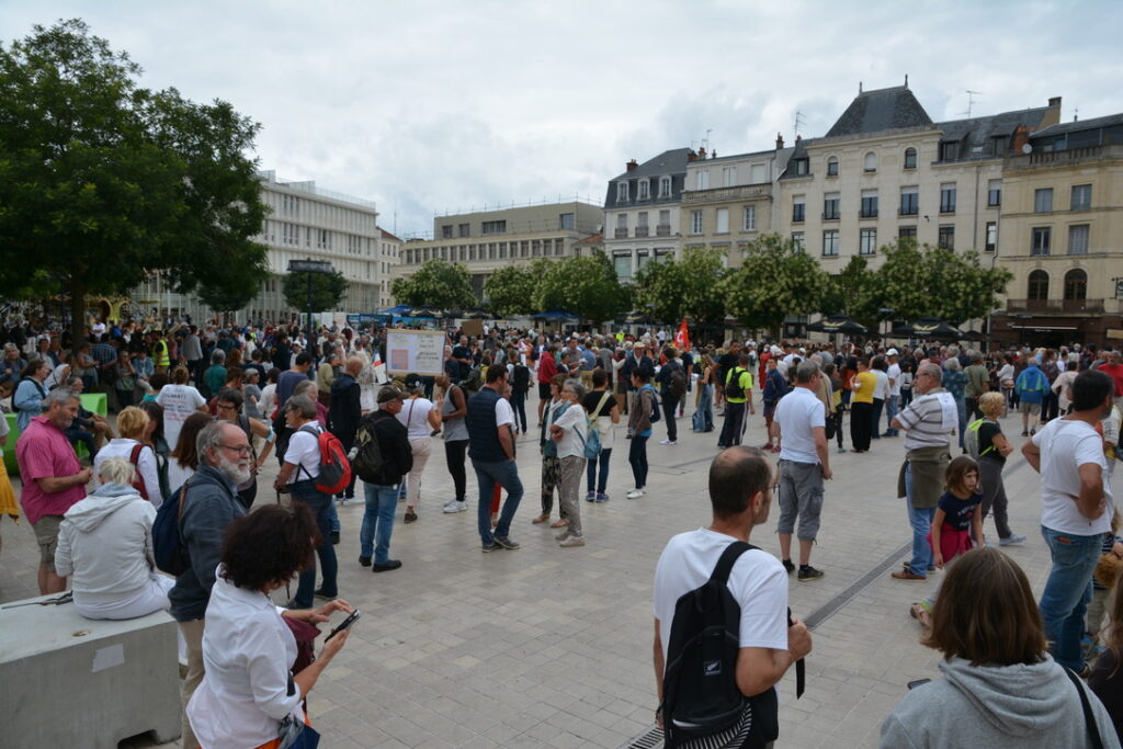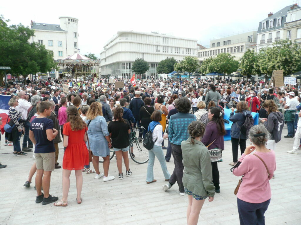 Difficile d’être précis quant à la participation mais sans doute plus importante qu’il y a quinze jours et pas loin de la semaine dernière : 700, 800 personnes ? [La presse locale annonce même près de 1 000 personnes !] En plein été, une situation inédite à Poitiers : comme quoi, il y a comme un malaise. Les pratiques macroniennes du pouvoir, la duplicité érigée en principe de gouvernement depuis des années et avec éclat depuis janvier 2020, ça laisse des traces : ordre et contre-ordre, mensonges,… c’est la rupture avec les institutions, avec le cadre politique existant,… comment faire confiance et ne pas tomber dans la défiance ?