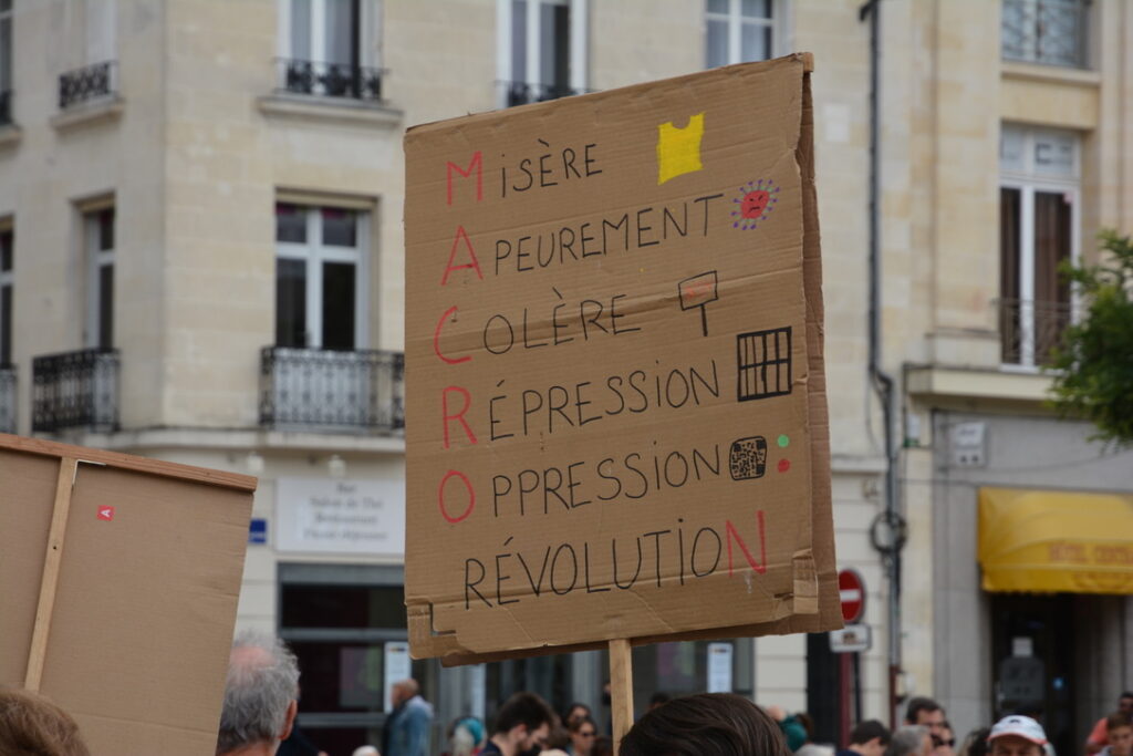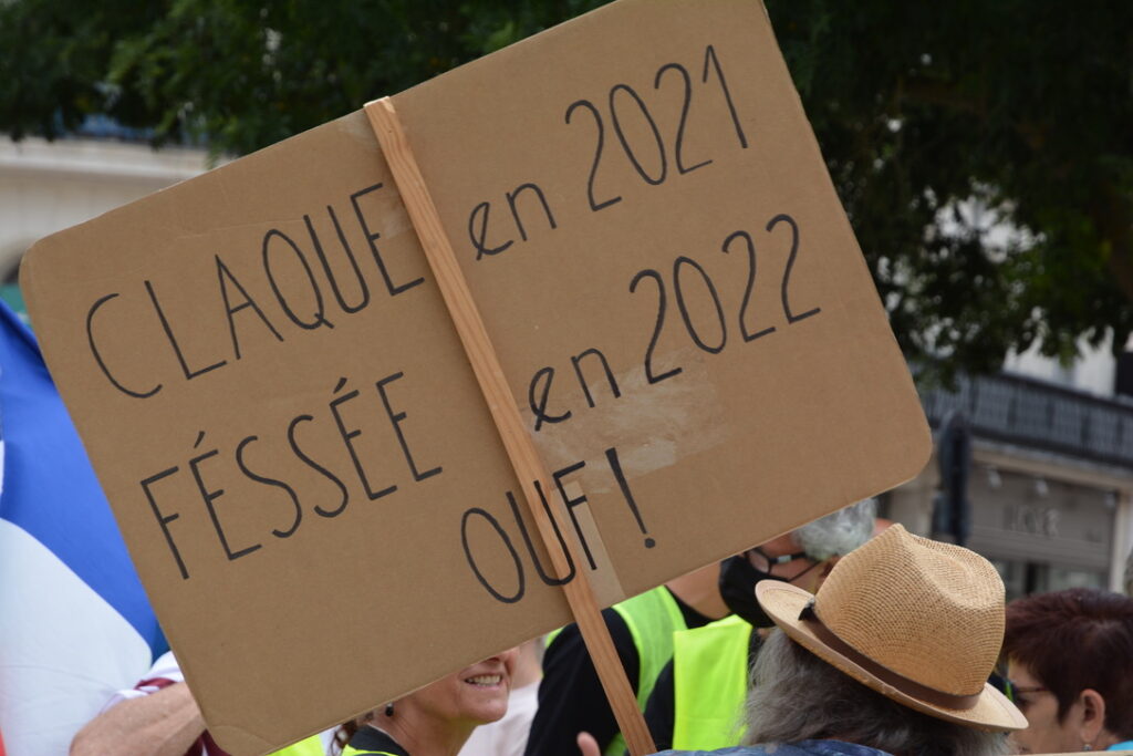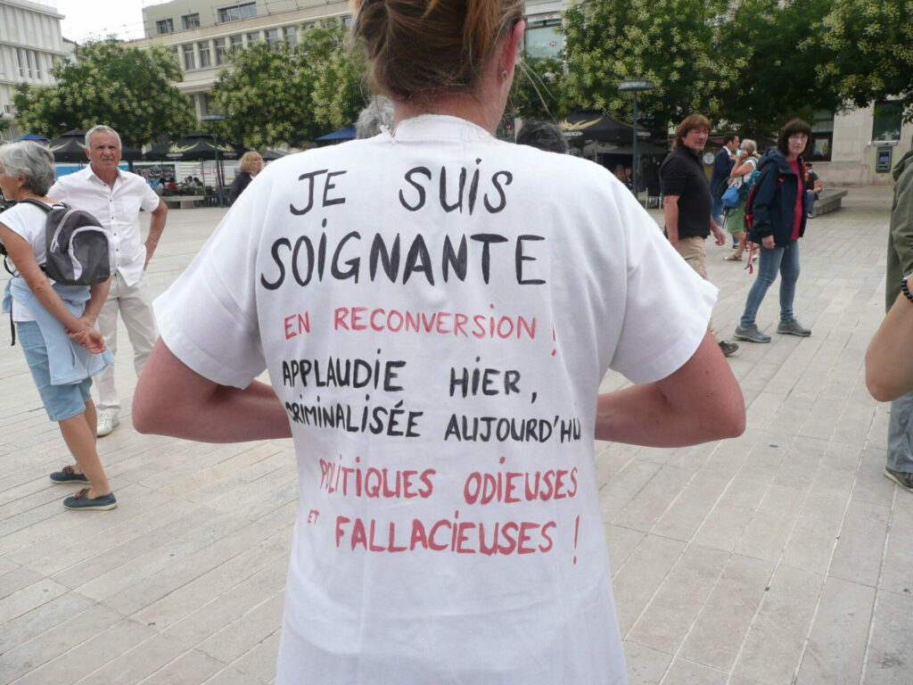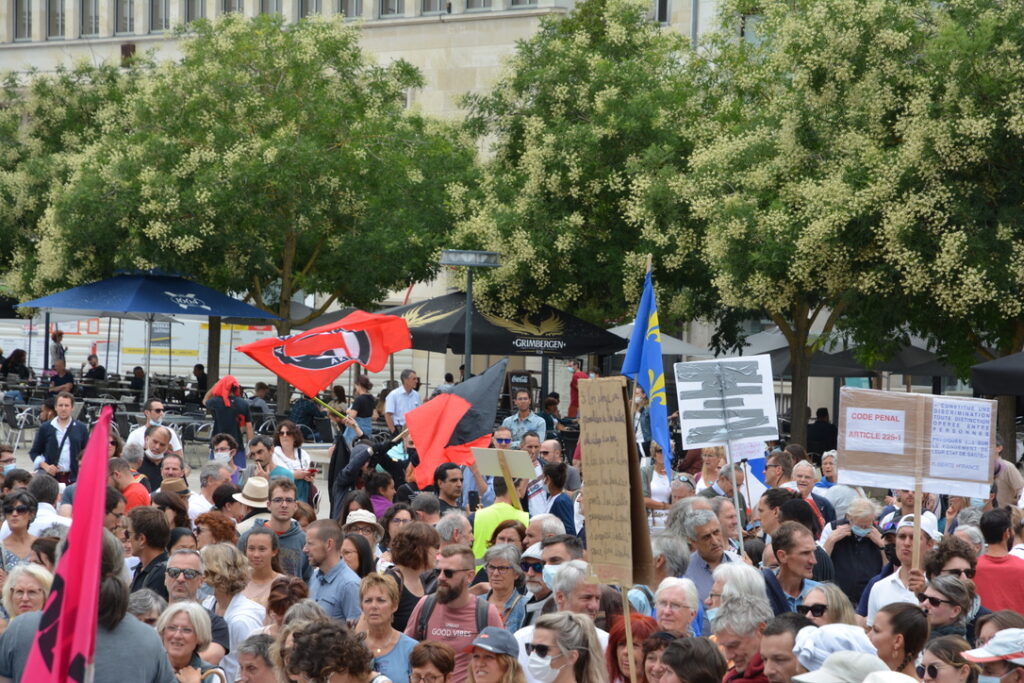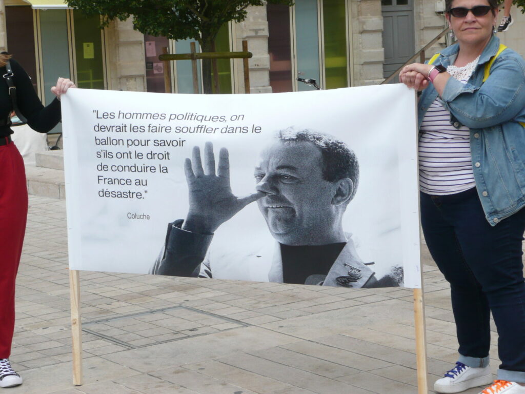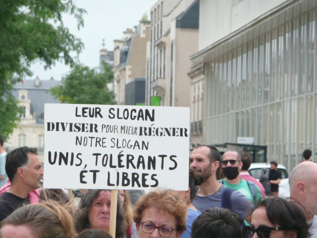 Difficile d’être précis quant à la participation mais sans doute plus importante qu’il y a quinze jours et pas loin de la semaine dernière : 700, 800 personnes ? [La presse locale annonce même près de 1 000 personnes !] En plein été, une situation inédite à Poitiers : comme quoi, il y a comme un malaise. Les pratiques macroniennes du pouvoir, la duplicité érigée en principe de gouvernement depuis des années et avec éclat depuis janvier 2020, ça laisse des traces : ordre et contre-ordre, mensonges,… c’est la rupture avec les institutions, avec le cadre politique existant,… comment faire confiance et ne pas tomber dans la défiance ?