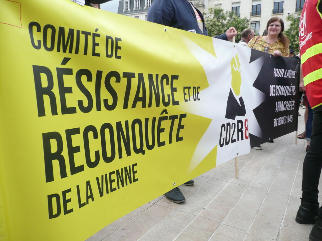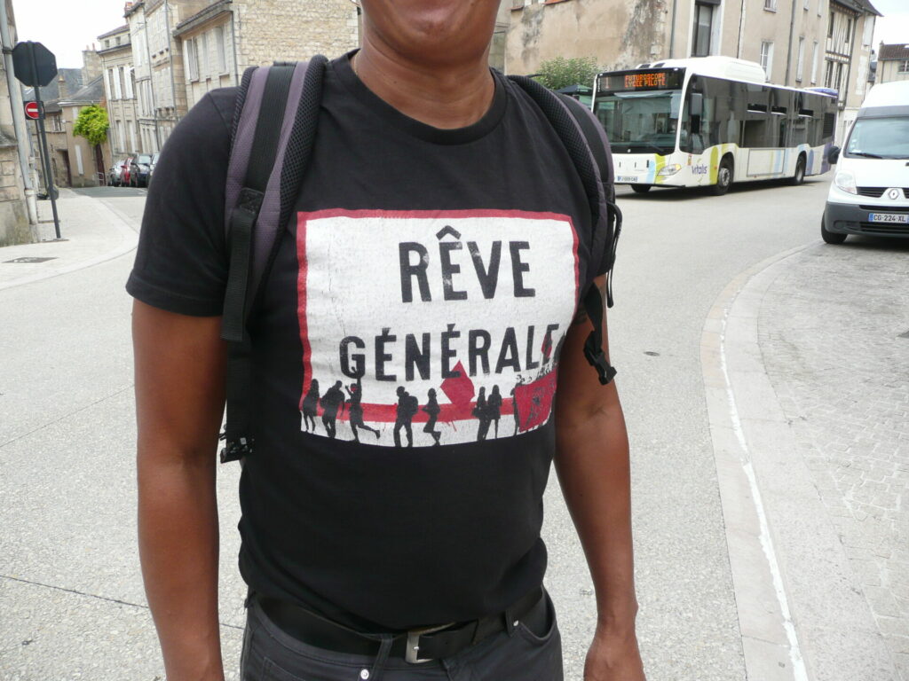 Quant aux personnes présentes, un mélange surprenant entre un public divers aux revendications larges et une frange militante identifiable mais avec peu de signes « distinctifs » : deux drapeaux de Solidaires 86 (qui appelait au rassemblement) et deux de la CGT. On peut aussi y ajouter des drapeaux bleu, blanc, rouge, des drapeaux libertaires, rouges et noirs, non loin d’un drapeau royaliste à fleurs de lys (!!!) : voir plus bas.