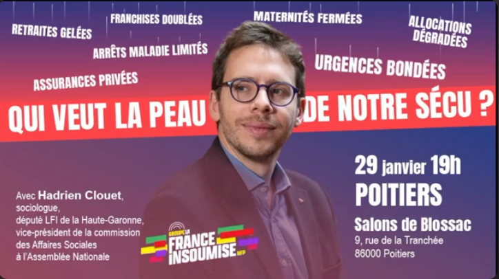 La France Insoumise dans la Vienne a invité Hadrien Clouet, député de Haute-Garonne et vice président de la commission aux affaires sociales de l’Assemblée Nationale, afin de discuter de la situation des services sociaux en France : hôpitaux, retraite, famille, travail… Salon de Blossac, le 29 janvier 2026.