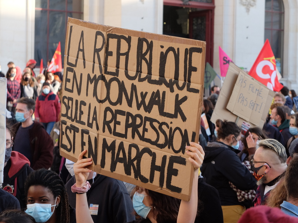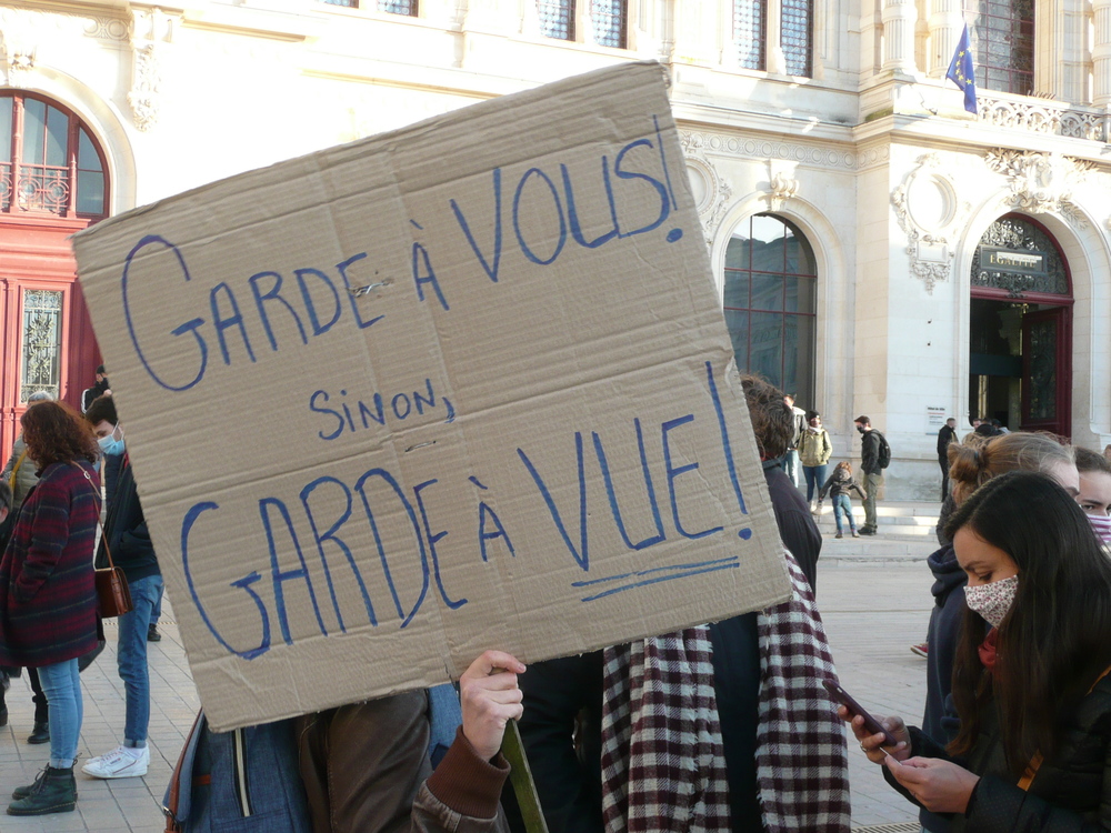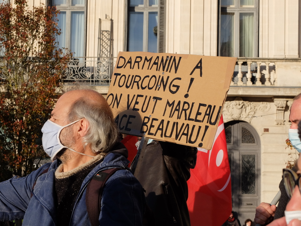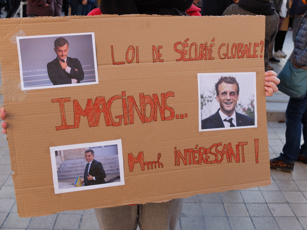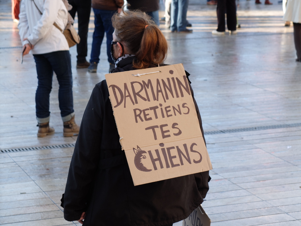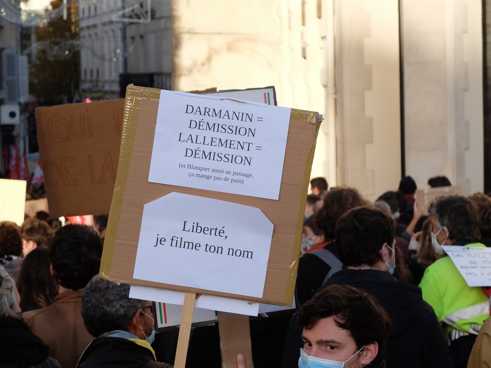 « Darmanin nous protège, ça crève les yeux » en référence aux Gilets jaunes