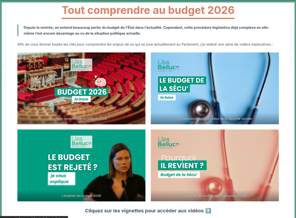 voir, écouter [vidéos] Lisa Belluco, députée Écologistes-NFP de la Vienne sur le budget Rédaction 9 février 2026 Toutes les vidéos sont à voir ici : https://www.lisabelluco.fr/tout-comprendre-au-budget-2026/ Partager : Partager sur Facebook(ouvre dans une nouvelle fenêtre) Facebook Envoyer un lien par e-mail à un ami(ouvre dans une nouvelle fenêtre) E-mail Partager sur LinkedIn(ouvre dans une nouvelle fenêtre) LinkedIn Partager sur Telegram(ouvre dans une nouvelle fenêtre) Telegram Partager sur WhatsApp(ouvre dans une nouvelle fenêtre) WhatsApp Partager sur Mastodon(ouvre dans une nouvelle fenêtre) Mastodon Partager sur Bluesky(ouvre dans une nouvelle fenêtre) Bluesky Rédaction Breaking News web86.info victime de son succès Des sous pour Web86 ! [vidéo] Il y a un an, Lisa Belluco était élue. Une longue interview avec la députée NUPES de la Vienne. Les caisses de grève et de solidarité dans la Vienne [vidéo] Clip de campagne NUPES 86 – V. Soumaille Succès de la compagne de financement participatif de web86.info Financement participatif de web86.info. Ça y est ! C’est parti ! [vidéo] Portrait d’un anticolonialiste conséquent [vidéo] À l’autre bout du monde vivent d’autres humains Extrême-droite dans la Vienne… misère, misère… (1) « Rien n’arrête un peuple qui danse ». La Parade des libertés à Poitiers Règles, menstruations, ragnagna Portrait de militant [Vidéo] Interview de Yves Judde qui a rencontré la sociologie et l’étranger Hélène Heintz Shemwell, activiste écologiste : la marge et la politique [vidéos] Lisa Belluco, députée Écologistes-NFP de la Vienne sur le budget [vidéo] Interview. Alerte au manque de pompiers dans la Vienne [Vidéo] Le 7 février à Châtellerault : Duplomb 1 ou 2, on n’en veut pas ! Samedi 7 février : manifestation à Châtellerault pour notre santé, les paysan.nes et l’environnement ! [vidéo] Une nouvelle vidéo sur l’hébergement solidaire dans la Vienne Soutien à « Filmer le travail » et coffret « Traversez la rue »