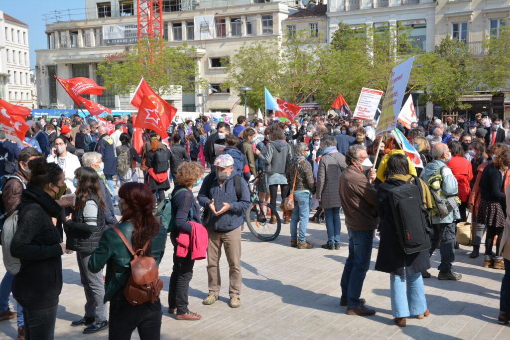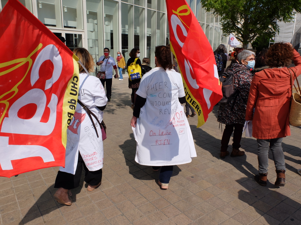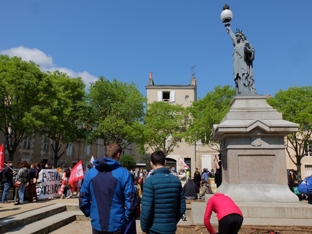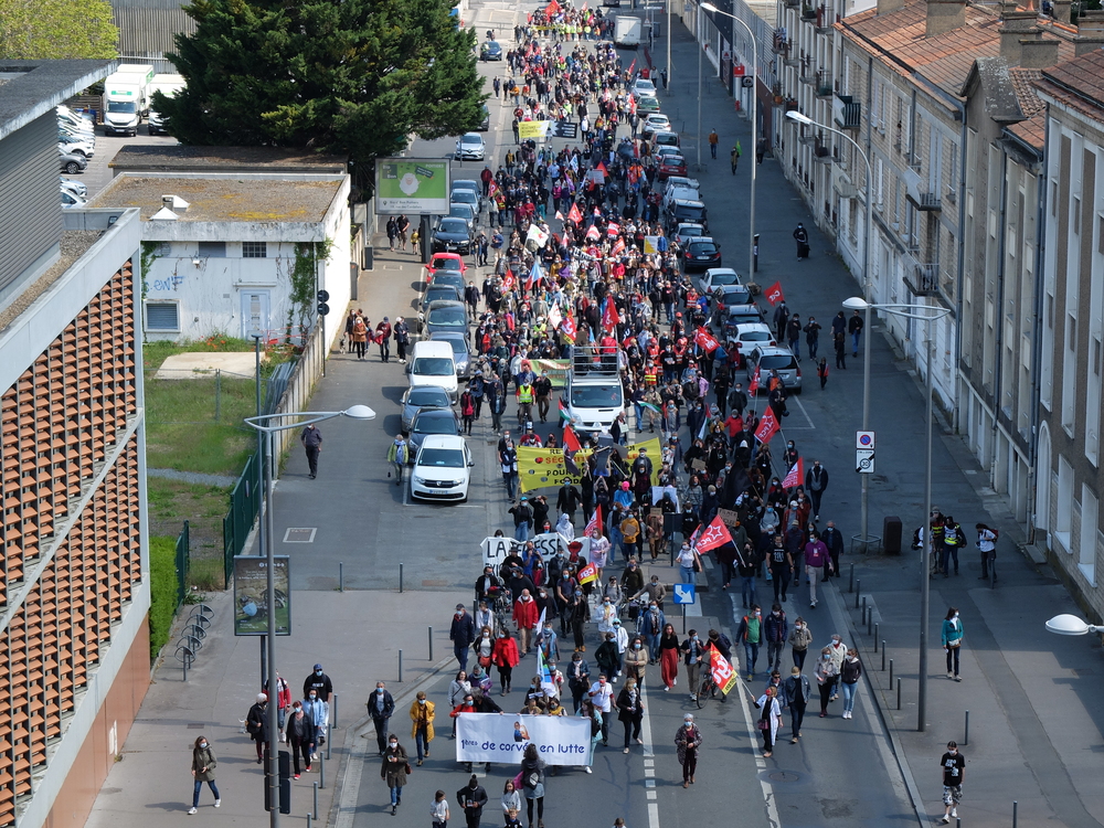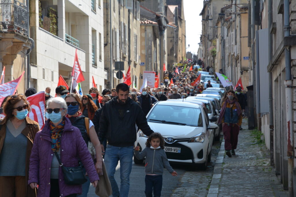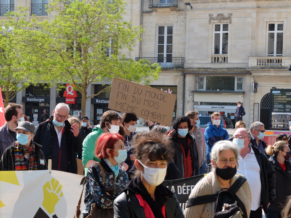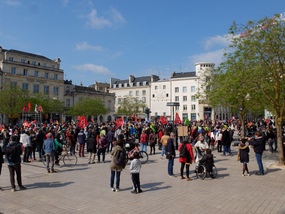 Il n’y a pas que le soleil, radieux qui peut expliquer l’affluence à la manifestation de ce samedi 1er mai. En effet, du monde il y en avait à Poitiers comme partout en France. Un bon millier de personnes, pour une manif animée mélangeant un public divers, de jeunes et de moins jeunes, de militant.es ou (peut-être) pas, sous les drapeaux, banderoles, pancartes et autres visuels, des organisations les plus diverses. Avec des prises de parole tout au long du cortège : des syndicats, de Poitiers Palestine, du collectif 86 Stop Sécurité Globale, des artistes en lutte depuis des mois et de tous les « Non essentiel » qui crèvent de la politique menée depuis des années et que la « crise » sanitaire ne cesse de mettre en évidence. Crise sociale d’abord, faillite politique qui se cache sous la duplicité et la manipulation permanente d’un gouvernement aux abois. Alors faisons de ce mois de mai qui commence le prélude d’un mouvement d’ampleur qui démontre dans la rue que le mouvement social est bien vivant et qu’il ne demande qu’à prospérer sur le fumier macroniste !