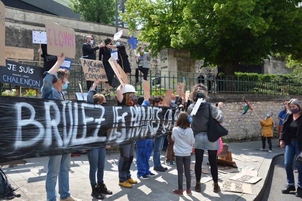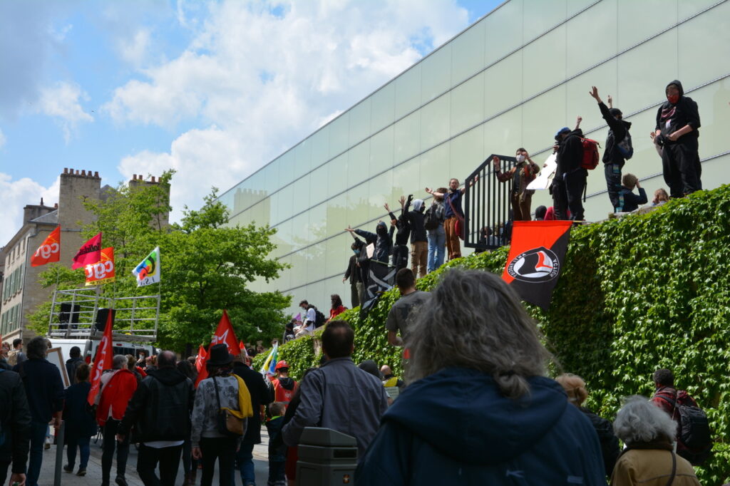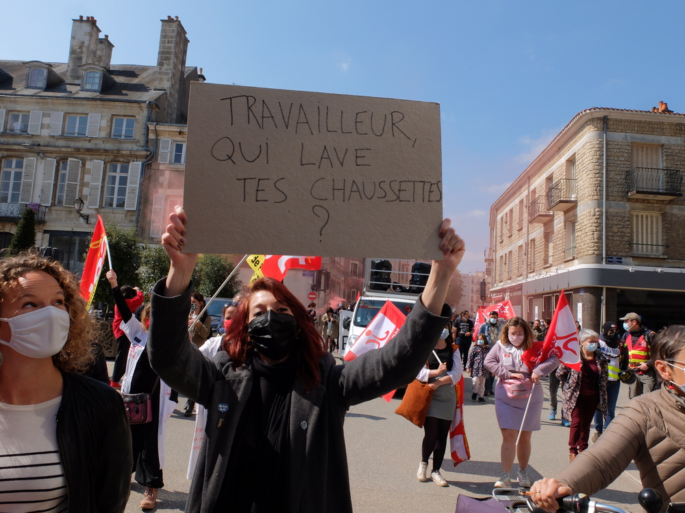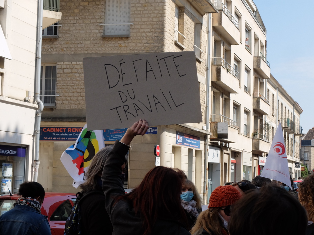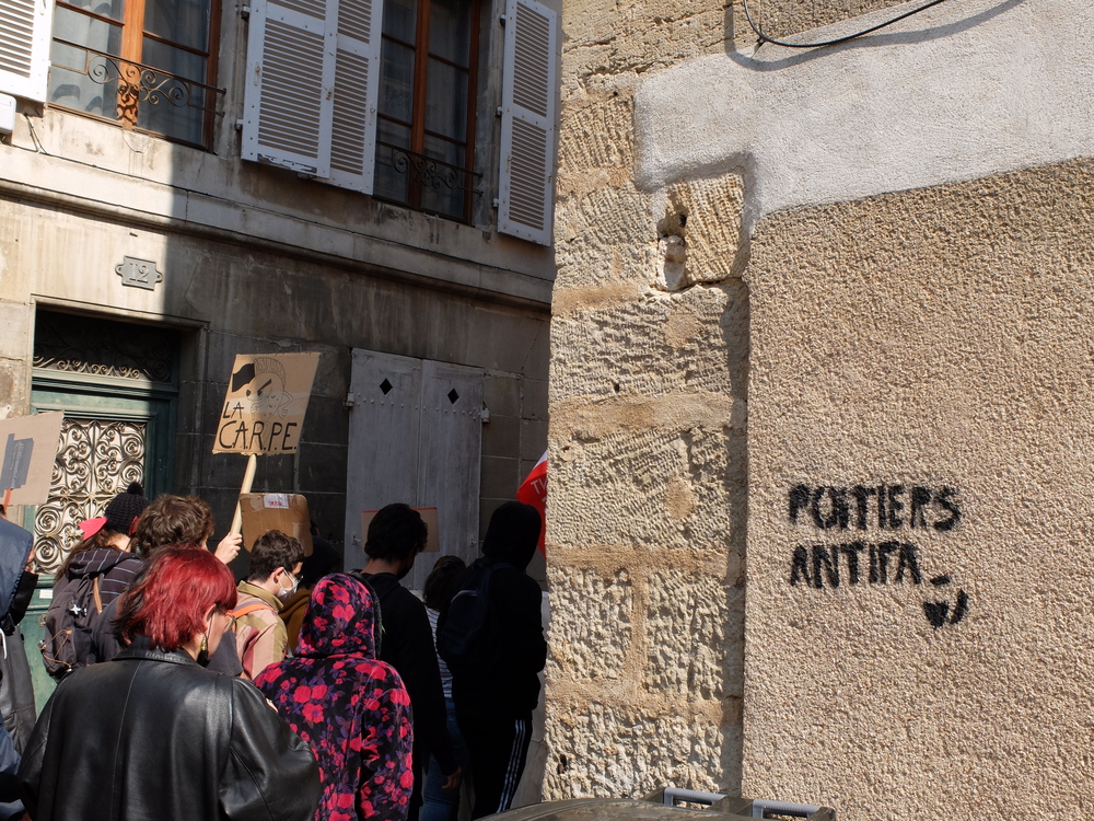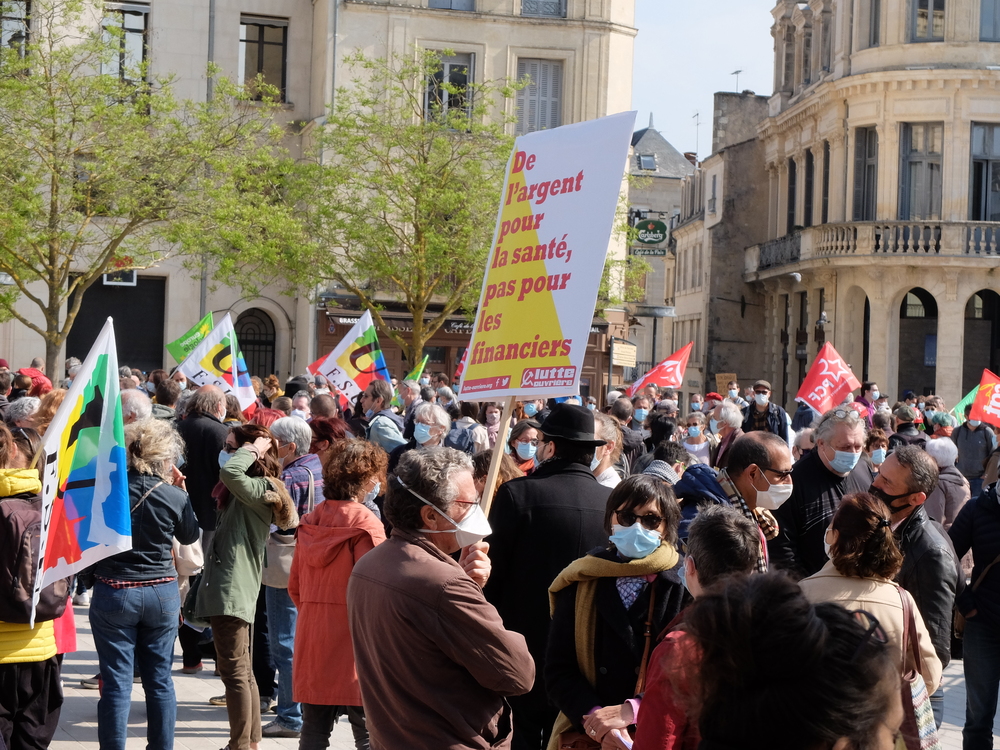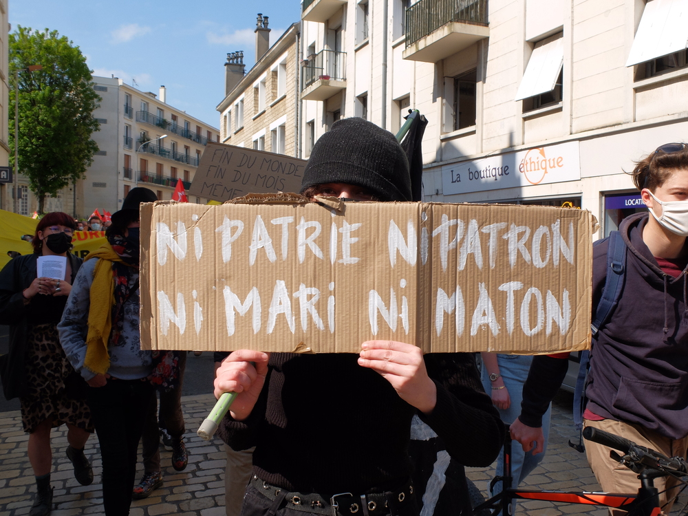 Il n’y a pas que le soleil, radieux qui peut expliquer l’affluence à la manifestation de ce samedi 1er mai. En effet, du monde il y en avait à Poitiers comme partout en France. Un bon millier de personnes, pour une manif animée mélangeant un public divers, de jeunes et de moins jeunes, de militant.es ou (peut-être) pas, sous les drapeaux, banderoles, pancartes et autres visuels, des organisations les plus diverses. Avec des prises de parole tout au long du cortège : des syndicats, de Poitiers Palestine, du collectif 86 Stop Sécurité Globale, des artistes en lutte depuis des mois et de tous les « Non essentiel » qui crèvent de la politique menée depuis des années et que la « crise » sanitaire ne cesse de mettre en évidence. Crise sociale d’abord, faillite politique qui se cache sous la duplicité et la manipulation permanente d’un gouvernement aux abois. Alors faisons de ce mois de mai qui commence le prélude d’un mouvement d’ampleur qui démontre dans la rue que le mouvement social est bien vivant et qu’il ne demande qu’à prospérer sur le fumier macroniste !