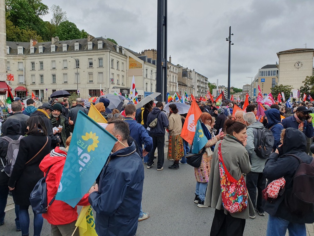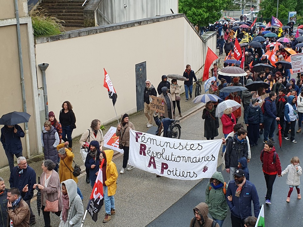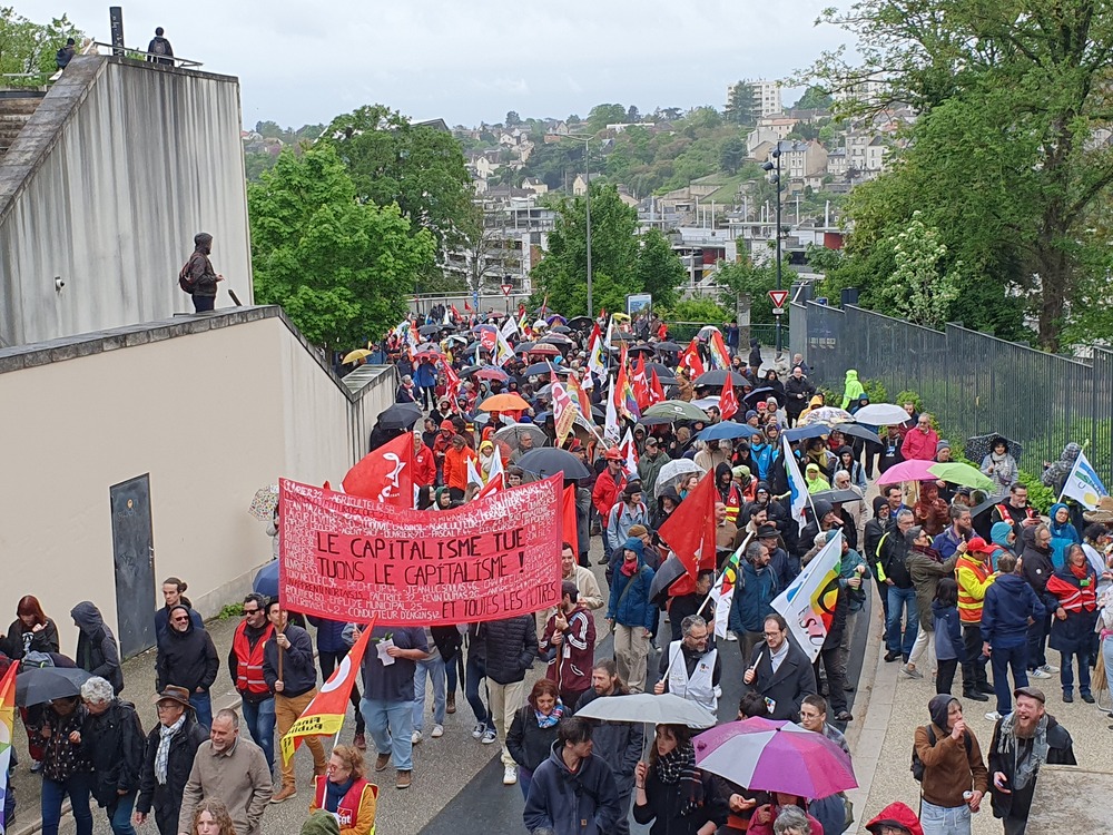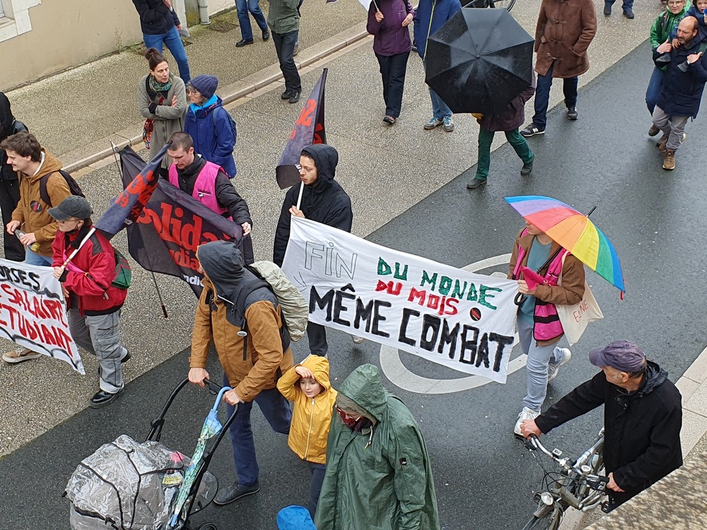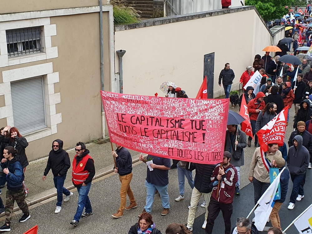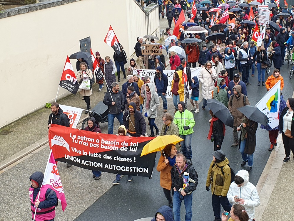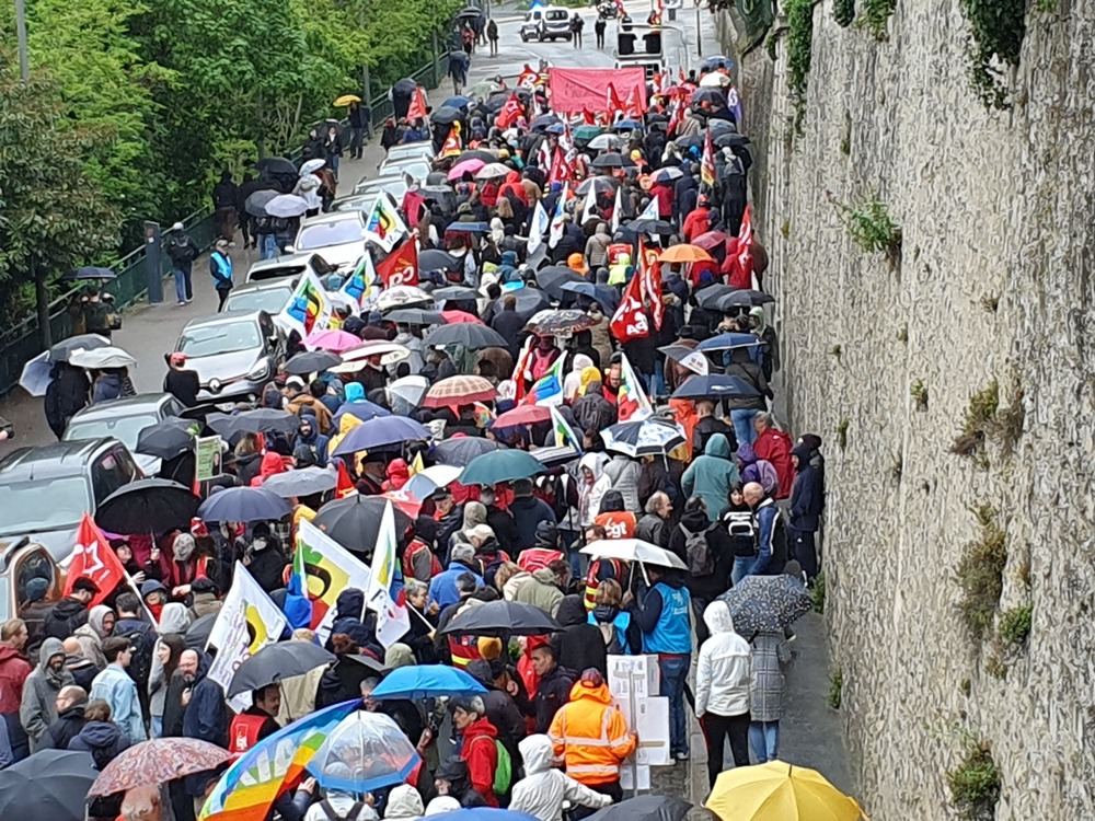 Pourtant cela avait mal commencé par une annulation des concerts prévus dans l’après-midi, pour cause de mauvais temps. Pourtant nous étions nombreuses et nombreux pour le défilé revendicatif. Plus d’un gros milliers, 1400 donné par l’intersyndicale. Et l’ambiance était à la fête, à la détermination avec un zeste de rage : un joli cocktail.