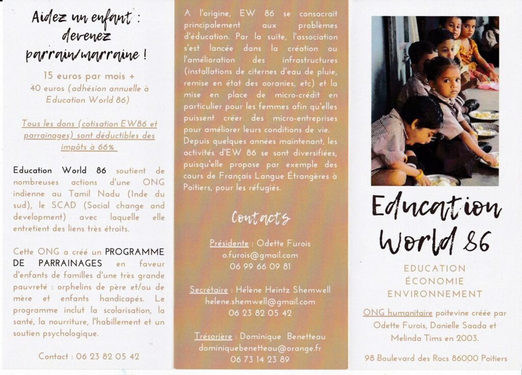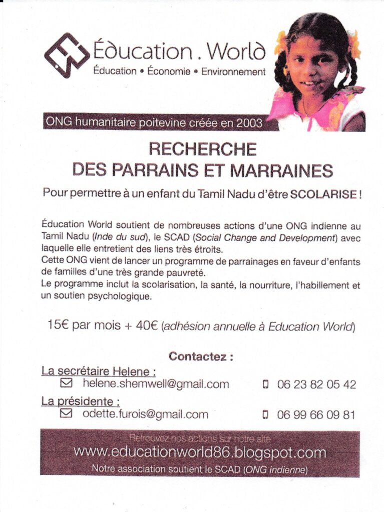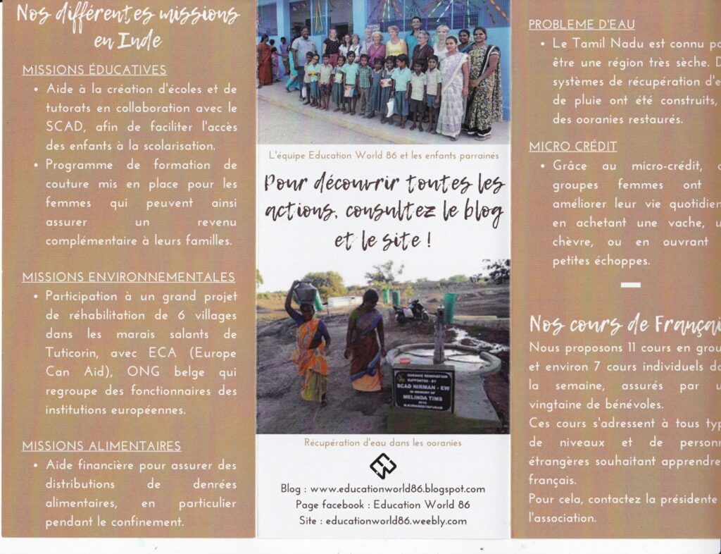 - à l’étranger : partenariats avec 3 ONG d’Inde du Sud, en direction de l’éducation et….. ( cf plaquette)